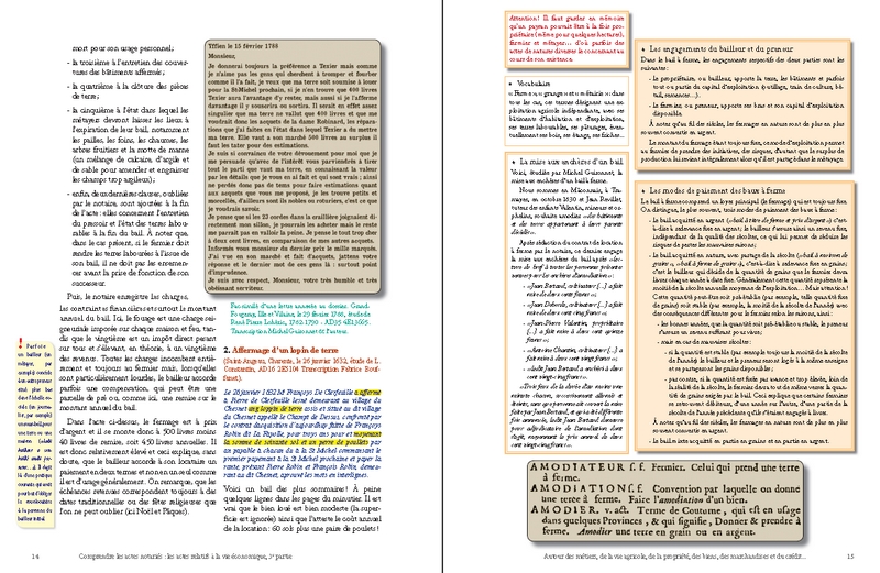 Cette prédominance du nombre des actes économiques s’explique d’ailleurs par l’importance des transactions concernant la propriété foncière : ainsi, les ventes, les partages et les échanges de biens immobiliers (maisons, boutiques, terres, prés, vignes, forêts…) et les baux de toutes natures liés à la gestion de la propriété agricole et à son exploitation (fermage, métayage, cheptel, location…) se rencontrent en abondance dans presque toutes les études de notaires. À côté de ces actes, le lecteur en découvrira d’autres tout aussi essentiels, souvent pittoresques, et d’un grand intérêt pour ses recherches : ce sont les visites de fermes, les devis de travaux et de réparations, les ventes aux enchères, les actes de crédit, les reconnaissances de dettes, les quittances, les obligations et les rentes les plus diverses…