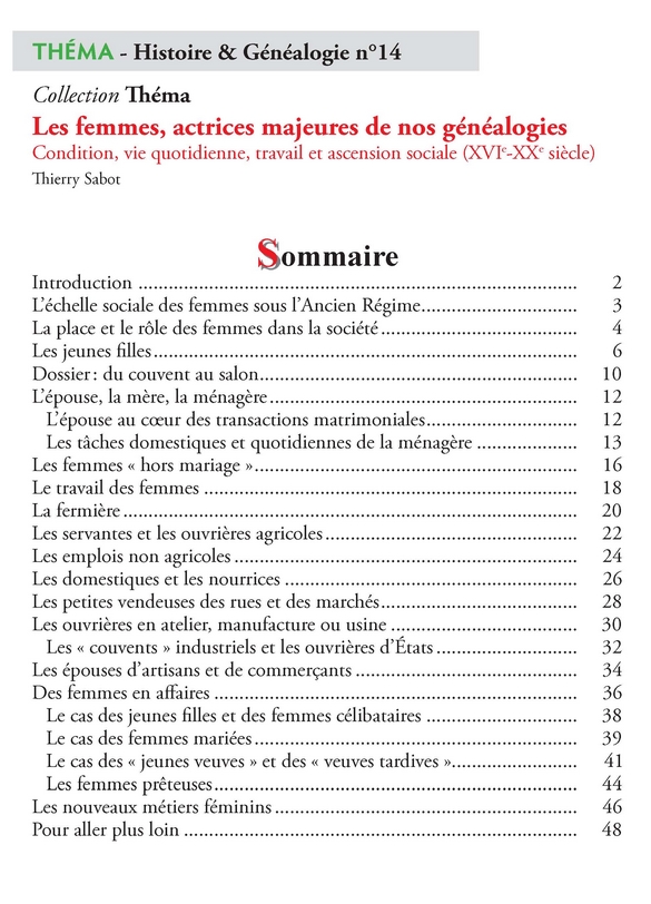 Ce fascicule examine la place et le rôle des femmes ainsi que leurs relations avec les hommes, dans les sphères familiale, sociale, économique, culturelle et religieuse… Il montre qu’elles occupent depuis toujours une place majeure au cœur de nos arbres généalogiques et de nos histoires de famille… et il remet en cause bien des idées reçues.