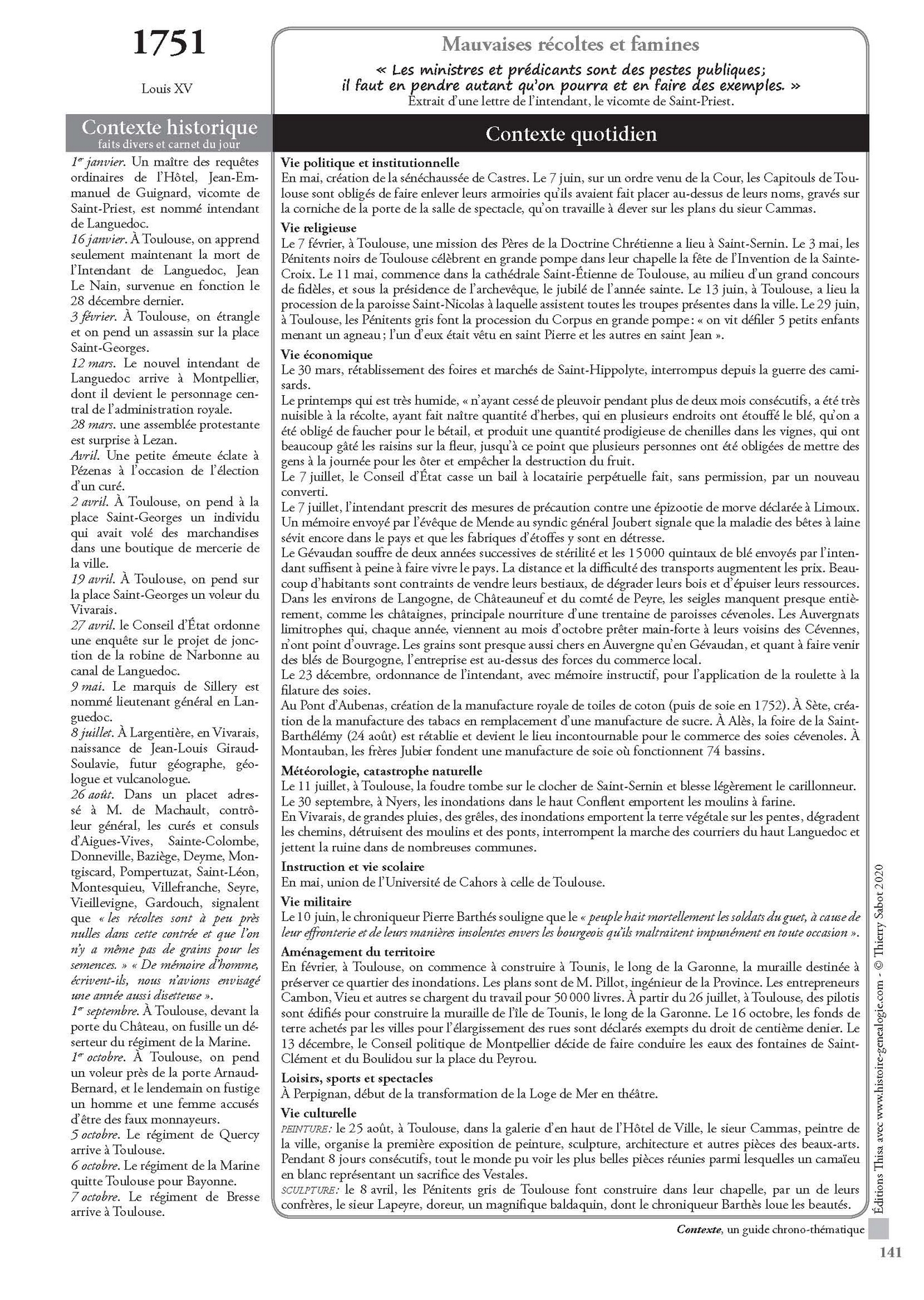 Toutefois, et c’est en cela que les déclinaisons régionales innovent, pour saisir au plus près le contexte quotidien local, j’ai complété le plus souvent possible le cadre chronologique par des témoignages d’époque, des récits de voyages, des mémoires, des livres de raison, des mentions insolites issues des registres paroissiaux, des documents historiques ou des récits d’historiens rédigés au fil des siècles passés. Ces témoignages, souvent commentés, sont présentés dans des encadrés qui s’insèrent entre les fiches chrono-thématiques. Par leur « authenticité » et leur diversité, ces récits plongent le lecteur dans un passé souvent insoupçonné. Ils nous livrent également une foule d’informations parfois anecdotiques, comiques, dramatiques, étranges ou énigmatiques. D’autant que la vaste région présentée ici ne manque pas de célèbres épisodes historiques : le catharisme et l’Inquisition, l’expansion du calvinisme, les soulèvements des Croquants, les épidémies de peste et autres maladies, les dragonnades, la révolte des Camisards et « le grand brûlement des Cévennes », l’affaire Calas, la bête du Gévaudan, l’affaire du comte de Solar, la révolte des masques armés, la contre-révolution de Jalès, l’auberge rouge de Peyrebeille, la révolte des « demoiselles », les réfugiés carlistes, les grèves de Carmaux, la crise viticole et la révolte des « gueux »...