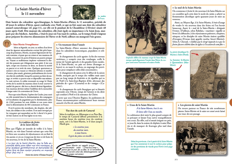 En suivant une approche calendaire, au rythme des travaux agricoles saisonniers et des cérémonies profanes et religieuses, voilà le cadre du voyage dans le temps que je vous propose au fil des pages de cet almanach. Vous ne serez pas étonné d’y rencontrer François Rabelais, le poète Claude Gauchet, les abbés Thiers, Pochard, Jean Lebœuf, Aulanier, mais aussi Jacques de Voragine, Hildegarde de Bingen, le missionnaire Michel le Nobletz, le curé d’Ars, Gargantua, la fée Mélusine, le Dahou, la Grand’ Gueule, la Maisnieye-Hennequin, la Tarasque, le fantôme de la Brie, Olivier de Serres, le sieur de Gouberville, Madame Gacon-Dufour, Anatole Le Braz, Frédéric Mistral, Eugène Le Roy, Émile Guillaumin, Henri Vincenot, Émile Zola et toute une foule de saints protecteurs et « merveilleux »...