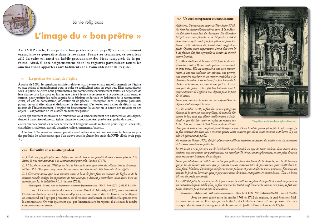 Mais dans beaucoup de paroisses, ces livres sont aussi le confident du prêtre qui, en véritable « journaliste » local, note dans les actes, dans les marges ou sur les feuillets restés blancs des mentions insolites, événementielles, sur le temps, les récoltes, les fléaux, la fluctuation des prix, les faits divers, les naissances ou les sépultures extraordinaires et bien d’autres sujets encore…