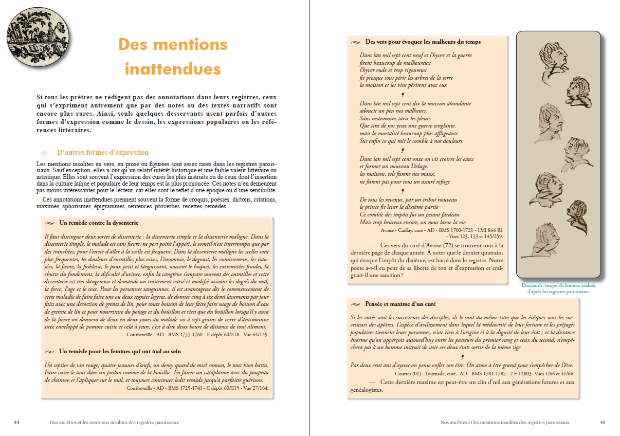Avec cet ouvrage, je vous propose une étude générale de ce type de textes, une sélection de mentions insolites classées en chapitres thématiques, mais surtout j’espère partager avec vous ma curiosité pour ces anecdotes et vous donner envie de les étudier et les commenter pour compléter votre généalogie, l’histoire de votre famille ou de votre commune.